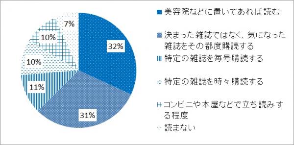 「美容院などに置いてあれば読む」32%、「決まった雑誌ではなく、気になった雑誌をその都度購読する」31%に回答が集中しました。また、特定の雑誌を毎号や時々購読する方は少なく、全体の2割しかいませんでした。