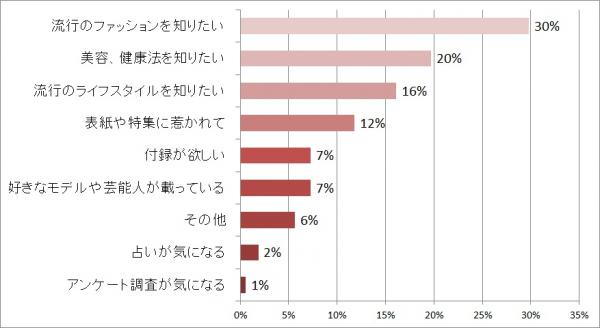 やはり「流行のファッションを知りたい」30%が最も多く選ばれました。続いて「美容、健康法を知りたい」20%、「流行のライフスタイルを知りたい」16%、と女性ファッション誌が貴重な情報収集源であることが判明しました。