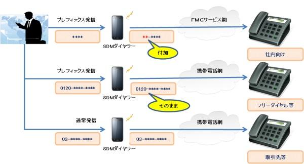 今回ご提供を開始する「SDMダイヤラー」機能は、ユーザーが電話発信時に付加したい番号を、管理者が一括事前設定することで、ユーザーはキャリアFMCサービスを意識することなく、活用することが可能となります。これにより電話帳に登録していない番号へもプレフィックス番号を容易に付与することが可能である為、キャリアFMCサービスの使用をユーザーに徹底させることが可能となります。