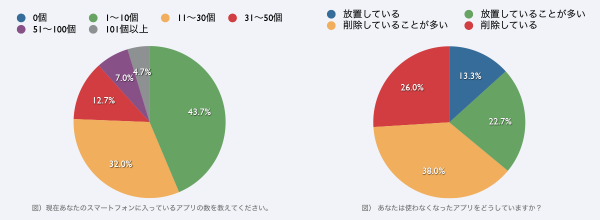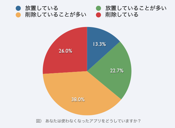使わなくなったアプリについては、「削除している」(26%)「削除していることが多い」(38%)という回答が多く、一度アプリをインストールしても使わなくなったら削除する傾向がうかがえる。