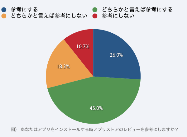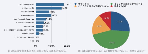 アプリストア内のレビューについても、「参考にする」「どちらかいえば参考にする」と回答したユーザーが7割以上で、参考にしないと回答したユーザーを大きく上回ることからも、アプリストアでのランキングやレビューがアプリのインストールに大きく影響していることがうかがえる。