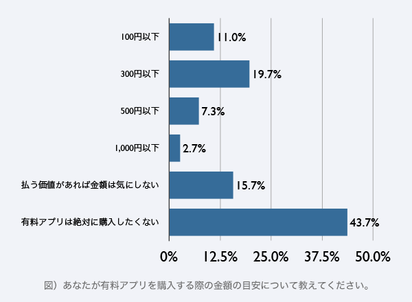 有料アプリの購入経験については「購入したことがある」(40%)「購入したことがない」(60%)となった。購入する際の金額目安について聞いたところ「100円以下」(11.0%)「300円以下」(19.7%)と、低価格帯の回答が中心だが、「払う価値があれば金額は気にしない」(15.7%)という回答も多かった。