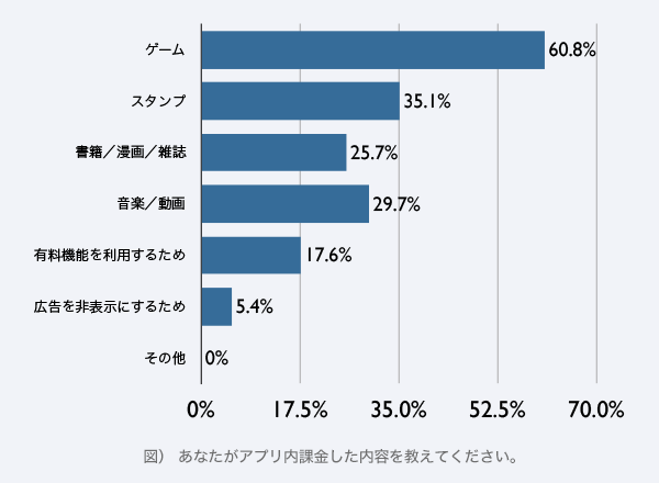 アプリ内課金をしたことがあるユーザーに課金内容を聞いたところ、「ゲーム」(60.8%)が最も多く、ゲームの次に多かったのは「スタンプ」(35.1%)、ついで「音楽/動画」(29.7%)「書籍/漫画/雑誌」(25.7%)「有料機能の利用」(17.6%)「広告非表示」(5.4%)となった。