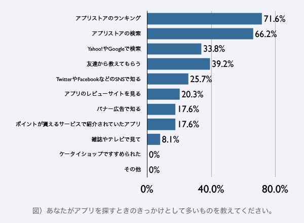 次に、アプリを探すときのきっかけについては「アプリストアのランキング」(71.6%)「アプリストアでの検索」(66.2%)が多く、ついで「友達から教えてもらう」(39.2%)「Yahoo!やGoogleで検索」(33.8%)「TwitterやFacebookなどのSNSで知る」(25.7%)「レビューサイトで知る」(20.3%)という回答となった。