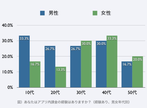 アプリ内課金をしたことがあるユーザーを男女年代別で見ると、男性の場合は10~40代までが平均値(25%)より高いのに対し、女性の場合は50代に加えて10代と20代も平均値を下回った。