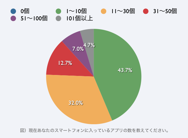 まず、スマートフォンにインストールされているアプリの数(端末購入時にプリインストールされていたアプリは除く)を調べたところ、「1~10個」(43.7%)「11~30個」(32.0%)という回答が多く、約8割のスマートフォンユーザーが30個以下であった。