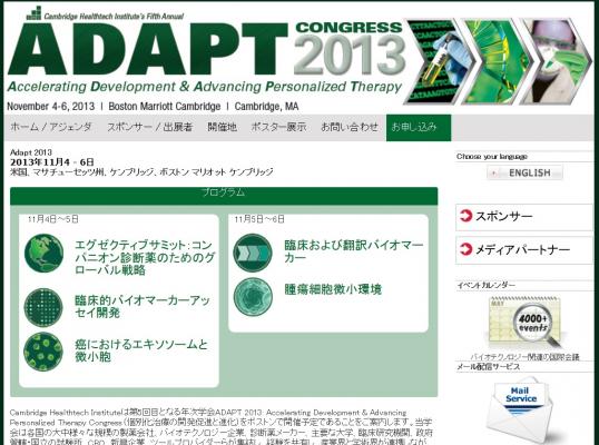 Cambridge Healthtech Instituteは第5回目となる年次学会ADAPT 2013: Accelerating Development & Advancing Personalized Therapy Congress(個別化治療の開発促進と進化)をボストンで開催予定であることをご案内します。当学会は各国の大中様々な規模の製薬会社、バイオテクノロジー企業、診断薬メーカー、主要な大学、臨床研究機関、政府管轄・国立の試験所、CRO、新興企業、ツールプロバイダーらが集結し、経験を共有し、産業界と学術界が連携しながら、新興技術を評価するための学会です。このほか、意思決定者向けの最新研究を網羅した科学的セッションや戦略的プレゼンテーション、およびブレインストーミングセッションなど、バランスのとれた内容でお届けします。