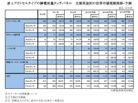 ◆ 2013年のアウトセルタイプの静電容量方式タッチパネルの世界市場は10億500万枚と予測、スマートフォン、タブレット端末に加えノートPC搭載が拡大