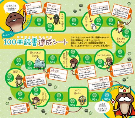 ▼読んだ冊数のマークをチェックしたり、なめこ(はえたて)の達成シールを貼って、100冊読破を目指そう!