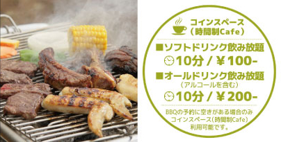 今までの食材・飲み物持込みOKのバーベキューサービスに加え新たに、空いているお席をもっと気軽にご利用いただけるコインスペースCAFEサービスをスタート。ご利用の際にソフトドリンクorアルコール飲み放題をお選びいただき、お客様のスタイルに合わせ気軽にお楽しみいただけます。もちろん飲食の持込みも可能ですので、ちょっとした休憩や待ち合わせなどさまざまなシーンでご利用いただけます。
