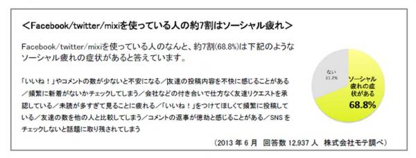 SNS利用者は、今や国内ネットユーザーの52%にあたる4,965万人(2013年5月ICT総研)にも上り、その中でも、約7割の方はSNSのつながりに疲れている、ソーシャル疲れの症状が見られるという調査結果(※2)が出ています。