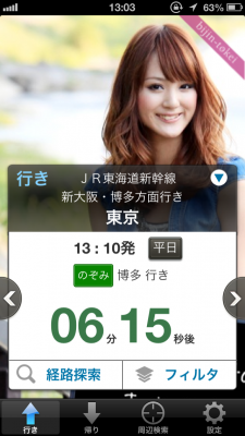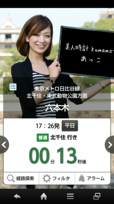10秒毎にランダムに画像が切り替わり、発車時刻までのカウントダウンを多くの美人が華やかに彩ります。