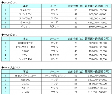 情報流通支援サービスの株式会社オークネット(本社:東京都千代田区/社長:藤崎清孝/URL http://www.aucnet.co.jp/))は、 2013年6月度のオークネットバイクオークションにおける成約台数を集計し、