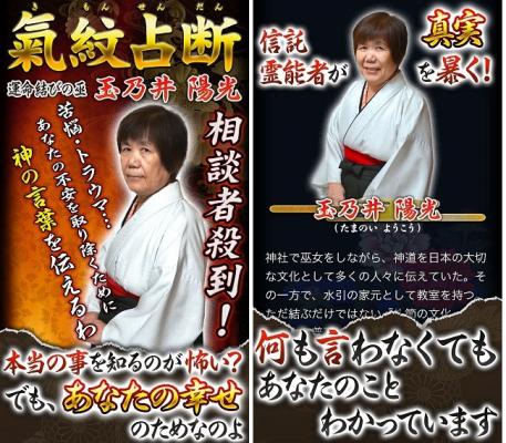 世の中には、どんなに思い悩んでも答えの出ないこともあります。また、人に相談できないこともあるでしょう。そんな時には、玉乃井陽光(たまのいようこう)に聞いて下さい。選ばれた巫女のみが出来るという驚異の「神おろし鑑定」で、真実のみお伝えします。知るのが怖いですか?でも、本当に問題を解決したいのなら、この【気紋占い(きもん)】で鑑定してみてください。あなたと幸せとの縁をしっかりと結ぶお手伝いをさせていただきます。