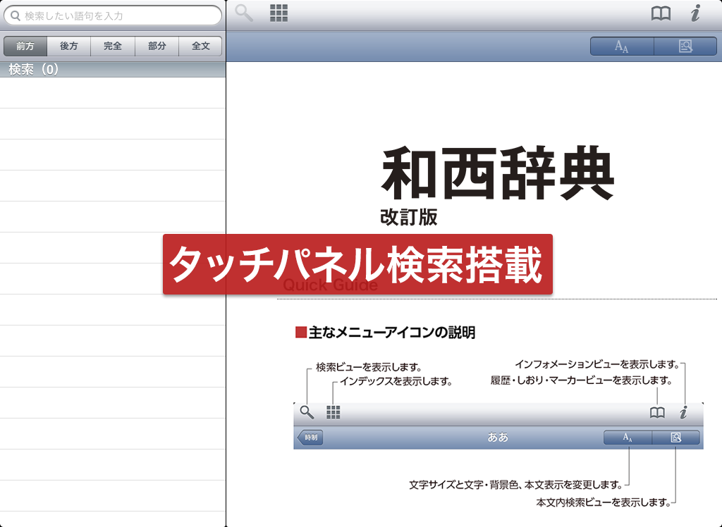 ・語数約45,000搭載 周囲の単語も見渡せるタッチパネル検索を搭載