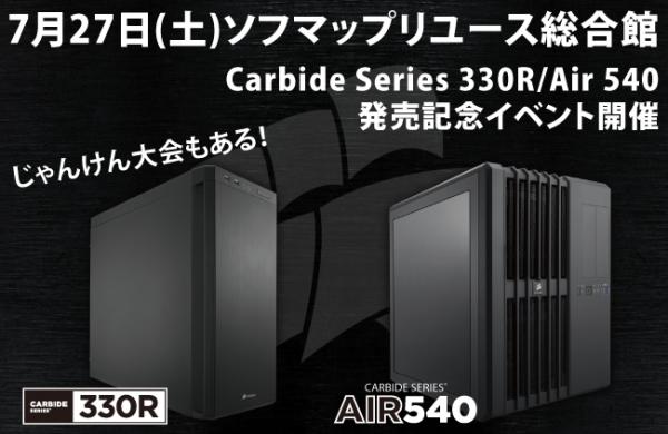 CORSAIR Carbide Series 330R/Air 540発売イベントは、COMPUTEX TAIPEI 2013で発表されたCORSAIR製PCケース Carbide Series 330R/Air 540の発売開始を記念した店頭イベントです。7月27日(土)秋葉原のソフマップリユース総合館で開催いたします。コストパフォーマンスに優れ、圧倒的な静音性を誇る330Rとデュアルチャンバ設計を採用したユニークなAir 540を、CORSAIRカントリーマネージャーの園部氏がデモ機を使ってプレゼンテーションいたします。また、国内未発表 CORSAIR製USBメモリなどを景品にした恒例のじゃんけん大会も実施予定です。