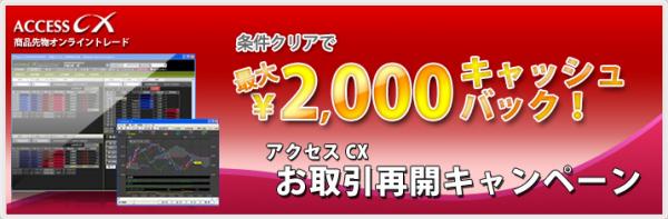 この度当社では、一定期間お取引の無いお客様に、期間中の取引手数料を最大2,000円キャッシュバックさせていただく、「アクセスCXお取引再開キャンペーン」を下記のとおり実施いたします。