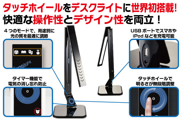 タッチホイールセンサーによる無段階光量調節は、デスクライトでは世界初です。