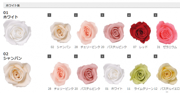 メインの色に対し人気の配色が一目でわかり、初めてプリザーブドローズを購入する初心者にも分かり
