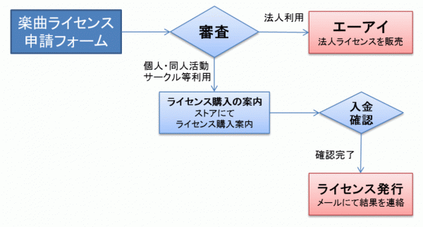 楽曲用ライセンス申請フォームから申請すると、利用者別にエーアイ・AHSより購入方法のご案内をいたします。