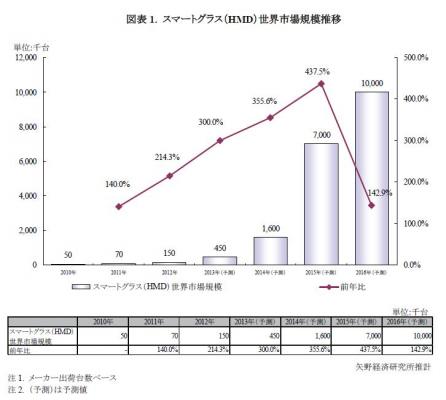 ◆ 2013 年スマートグラスの世界市場規模は45 万台を予測、2016 年は1,000 万台規模に