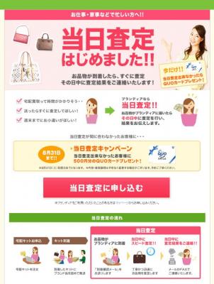 ブランド品宅配買取サービス業界No.1の「ブランディア」を運営する株式会社デファクトスタンダード(本社:東京都大田区、代表取締役社長:尾嶋崇遠)は、2013年8月1日より、品物の到着の確認を行った日に査定が完了しなかった場合はQUOカード500円分をプレゼントする、当日査定キャンペーンを開始いたしました。