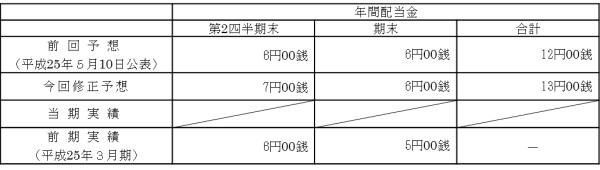 平成26年3月期の中間配当金につきましては、1株当たり6円を予定しておりましたが、基本方針である目標配当性向を目途に株主の皆様からのご支援に応えるべく、1円増配し1株当たり7円とさせて頂きます。これにより、中間配当金と期末配当金をあわせた平成26年3月期の1株当たり年間配当金は13円となる予定です。