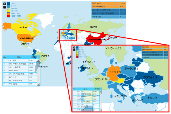 また、パテントファミリーを分かりやすく表示する機能やワールドマップなど、これまでの日本版・米国版にはなかった機能も搭載されています。特定分野における世界の技術動向や、注目企業の世界戦略の調査などにご活用いただけます。