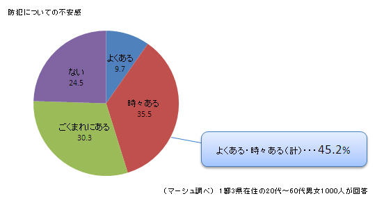 まず始めに自分や家族、自宅の防犯について、不安を感じたり心配になることがどれぐらいあるかを尋ねたところ、「よくある」(9.7%)、または「時々ある」(35.5%)と答えた人が45.2%となりました。「ごくまれにある」(30.3%)も合わせると全体の75.5%に上ります。
