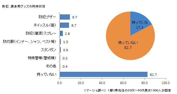 また、防犯・護身用のグッズを何か持っていますかと尋ねたところ、「防犯ブザー」が9.7%で最も多く、次が「ホイッスル」で8.7%。いずれかの防犯・護身用グッズを持っていると答えた人は全体の17.3%でした。