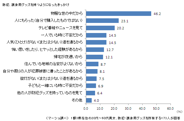 グッズを持つようになったきっかけとしては、「物騒な世の中だから」がトップで46.2%。また、12.7%の人が「怖い思いをしたり、ヒヤッとした経験があるから」とも答えています。