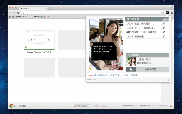 パソコンのデスクトップやスマートフォンのアプリなど、様々なデバイスで楽しんで頂ける美人時計に、新しくGoogle Chromeアプリが誕生しました。その名も「bijin-schedule(ビジンスケジュール)」。