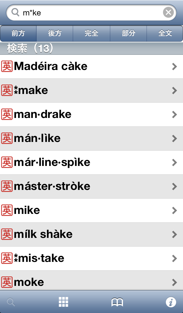 ●豊富な検索オプションを用意(前方一致検索・後方一致検索・完全一致検索・全文検索)。それぞれの検索方法で、文字を入力すると候補見出し語が表示されるインクリメンタルサーチに対応。(部分一致、全文検索を除く)用語をうろ覚えでも検索が容易です。