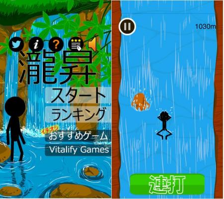 ボタン連打とスマホの傾けで、どんどん滝を登って距離を競うゲームです。