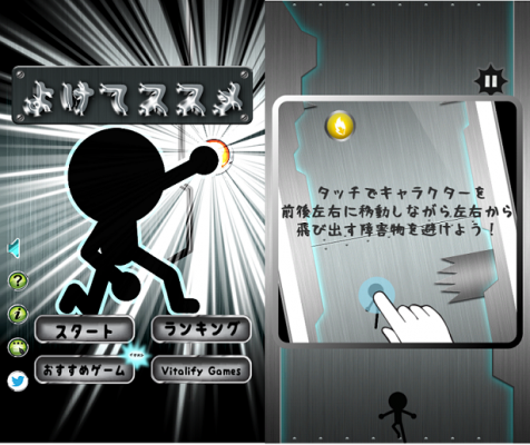 棒人間を指タップで操作して、左右から出てくる障害物を回避していくゲームです。