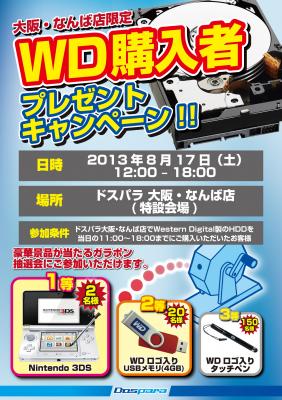 全国20店舗及びウェブ通販のパソコンショップを運営する株式会社ドスパラ (代表取締役社長:尾崎健介、本社:東京都千代田区)は、2013年8月17日(土)、 ドスパラ 大阪・なんば店にて、豪華賞品が当たる「WD購入者プレゼントキャンペーン!!」 を開催いたします。