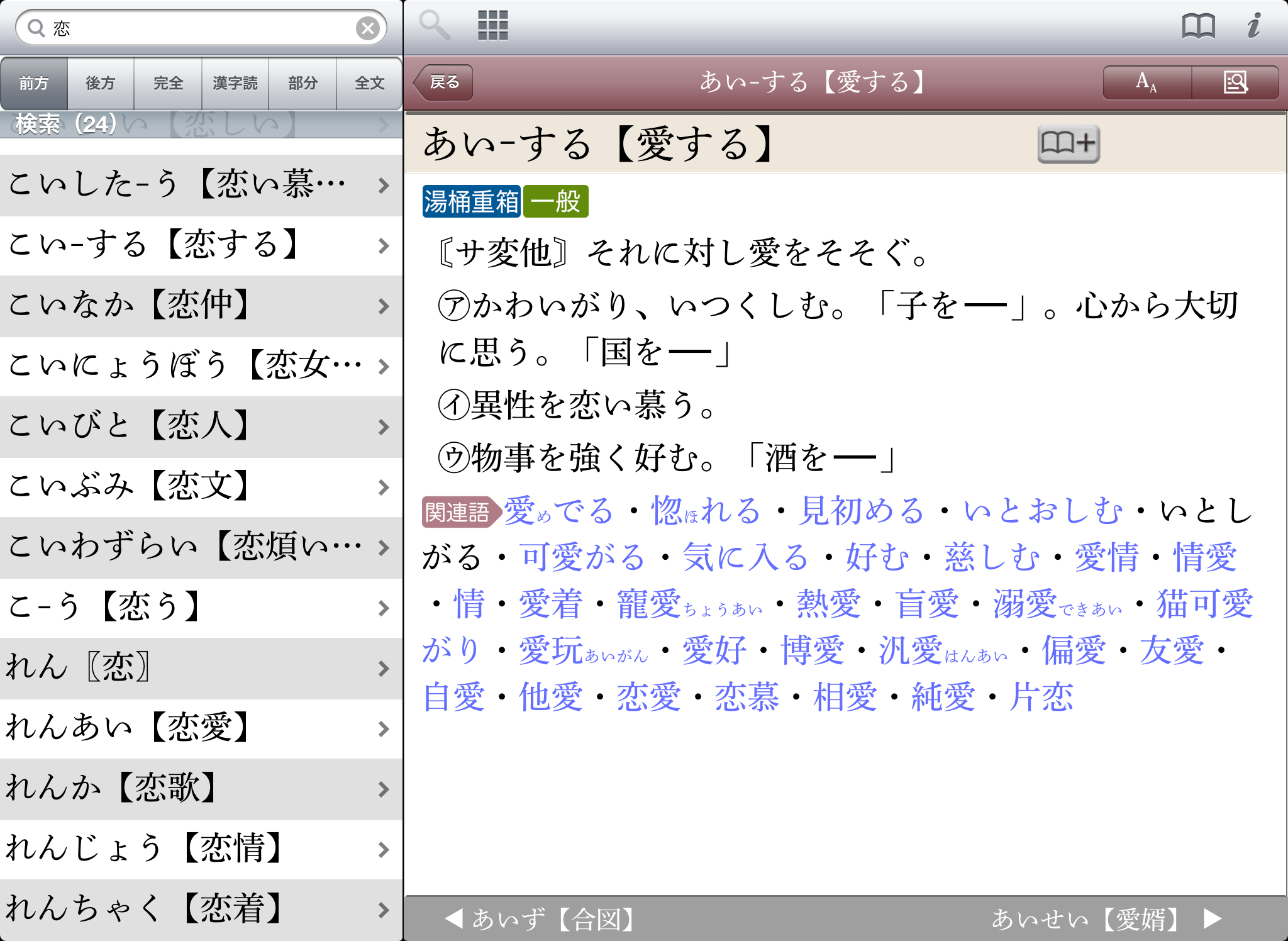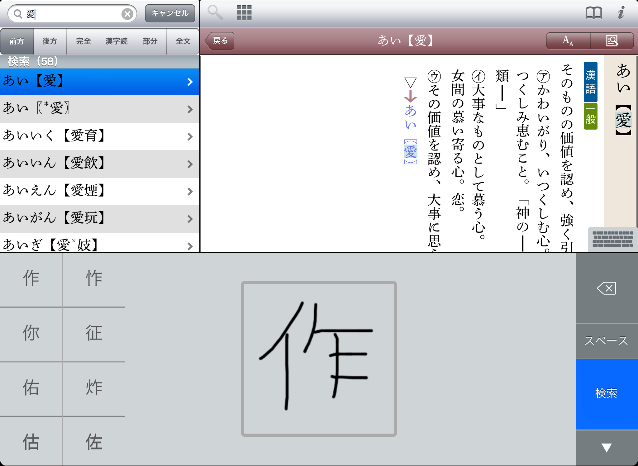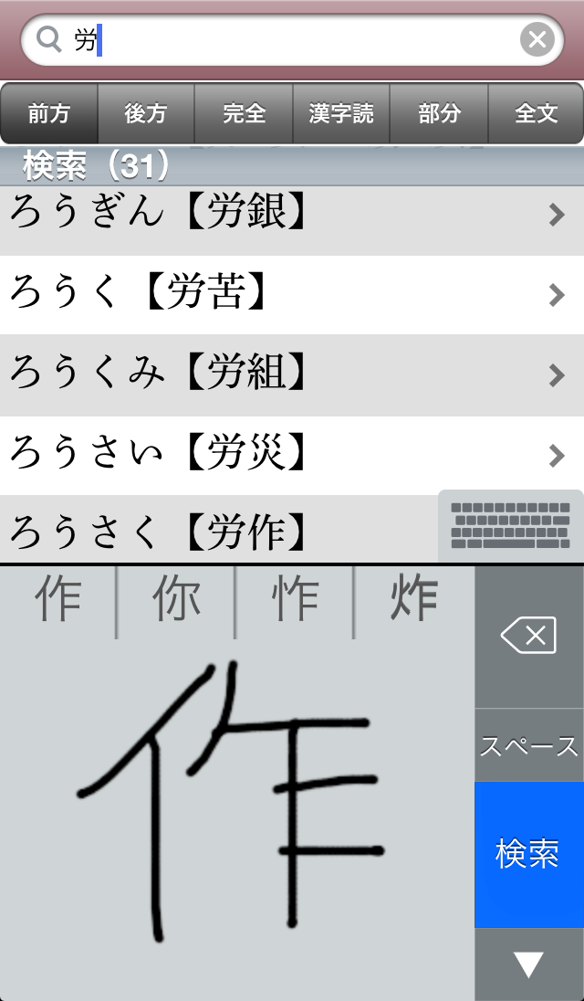 文字を入力すると候補見出し語が表示されるので、うろ覚えでも見つけやすい
