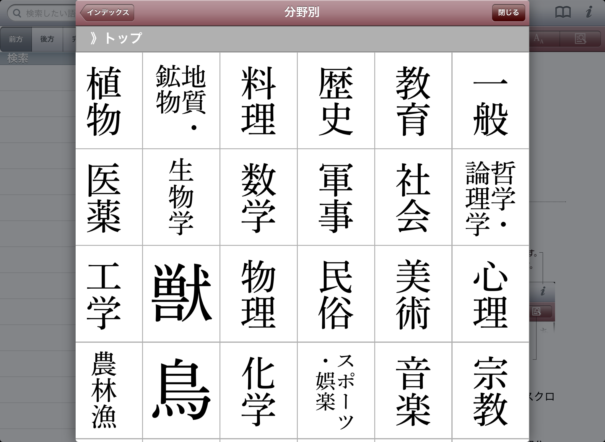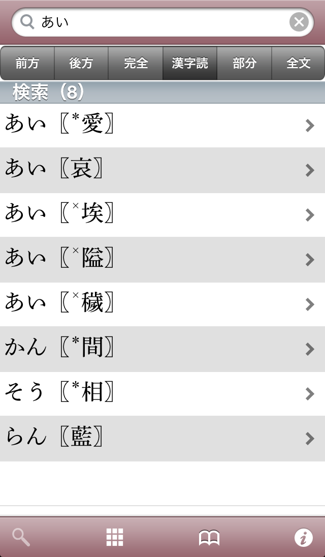 ●豊富な検索オプションを用意(前方一致検索・後方一致検索・完全一致検索・漢字読検索・部分一致・全文検索)。それぞれの検索方法で、文字を入力すると候補見出し語が表示されるインクリメンタルサーチに対応。(部分一致、全文検索を除く)用語をうろ覚えでも検索が容易です。