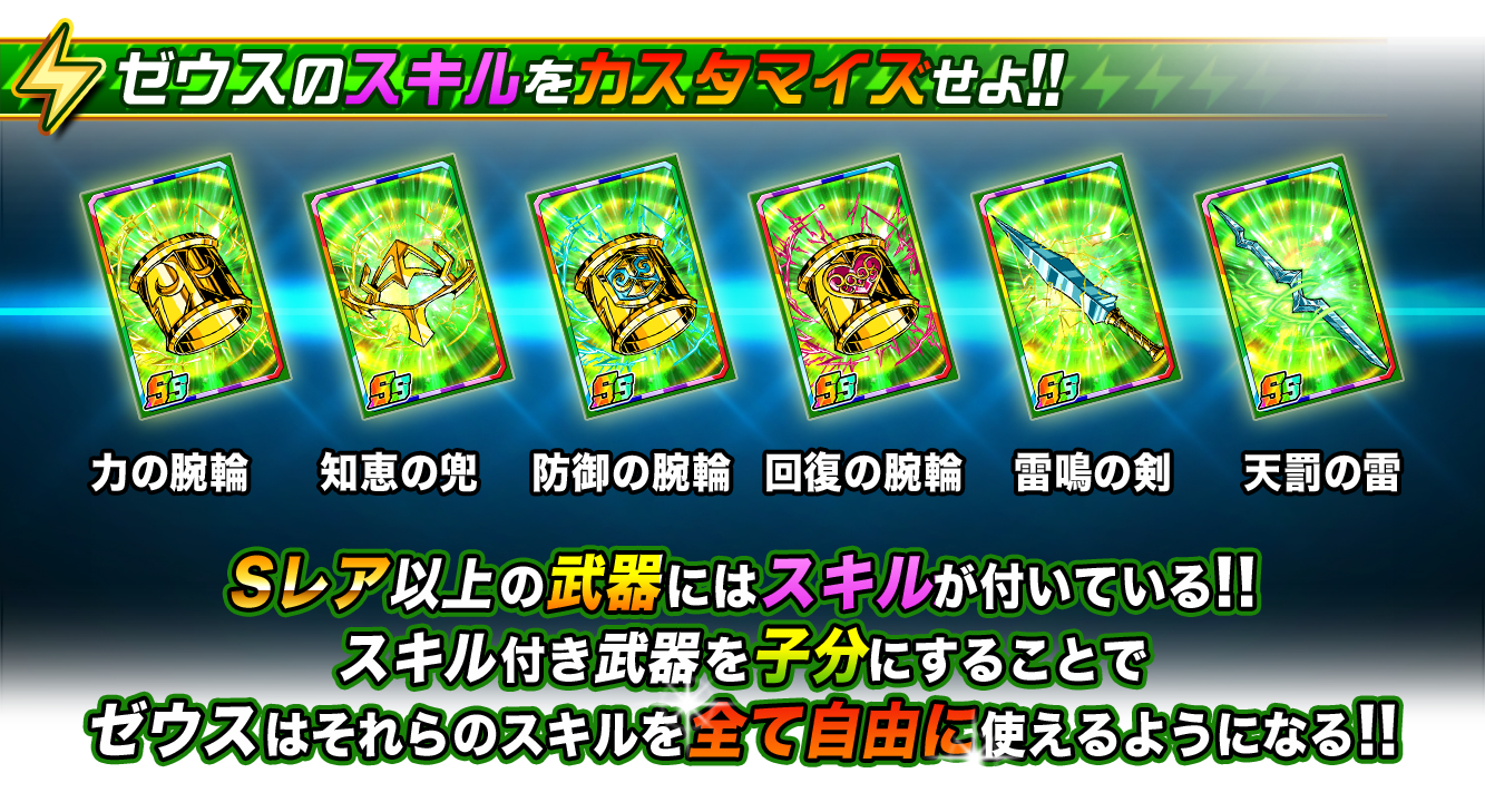 「ゼウス」専用の武器や防具を“限定ガチャ”やダンジョンで入手できたら、「ゼウス」カードの子分枠に装備してみましょう!すると、その装備した武器に応じて、あらゆるスキルが使用可能になります。