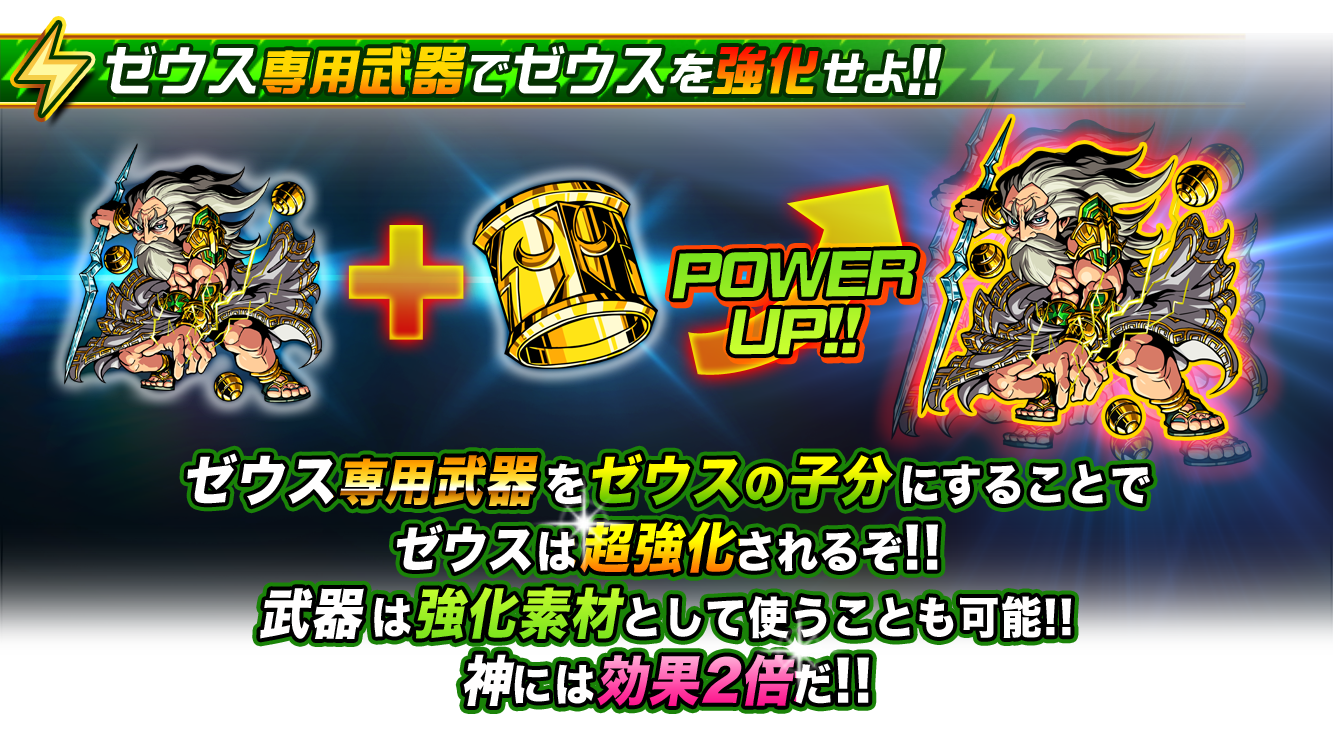 ゼウス専用の武器や防具はモンスターの強化用素材としても使用でき、中でも「神族」モンスターの強化で使用すると、得られる経験値が“2倍”にUPします。