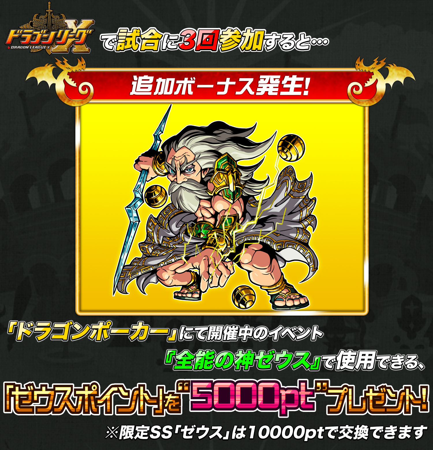 ⇒「ドラゴンポーカー」にて開催中のイベント『全能の神ゼウス』で使用できる、「ゼウスポイント」を“5,000pt”プレゼント!