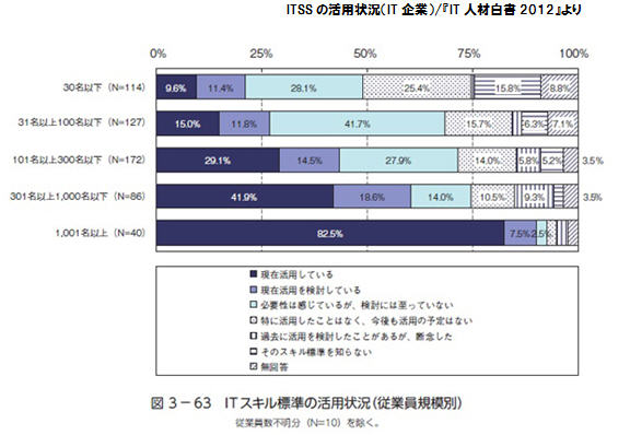 独立行政法人 情報処理推進機構(IPA)の発行する『IT人材白書2012』によると、大手IT企業では活用が進んでいる「ITスキル標準」が、中堅・中小企業では未だ活用が進んでいない現状が報告されています。