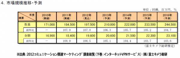 インターネットVPNは、流通、サービス、製造といった多拠点を有するユーザーの需要増加を受け、市場規模は継続して拡大しており、2014年は前年比105.7%※の成長が予測されています。バリオセキュアでは、拡大を続けるインターネットVPN市場に向けた「マネージドVPNサービス」を展開することで、価格と運用サポート両面よりユーザーニーズに対応したサービス提供してまいります。