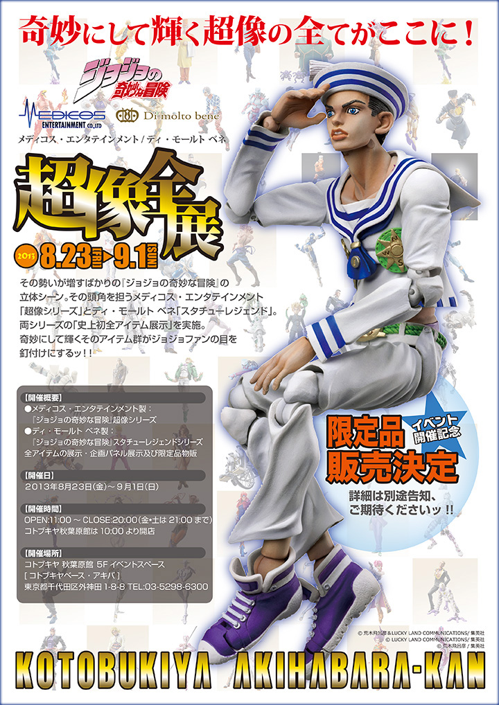 ホビーメーカーコトブキヤ(代表:清水一行 本社:東京都立川市曙町)直営店・コトブキヤ秋葉原館にて、8月23日から9月1日に、メディコス・エンタテインメント社製『ジョジョの奇妙な冒険』超像可動シリーズ、ディ・モールト ベネ社製『ジョジョの奇妙冒険』スタチューレジェンドシリーズ展示会「超像全展」が開催されます。両シリーズの誰も目にしたことが無い全アイテムの展示をはじめ、企画パネル展示や限定品物販も行います。イベント開催記念物販品として、スタチューレジェンド「プロシュート&グレイトフル・デッド セカンド」、更にワンダーフェスティバル2013[夏]メディコス・エンタテインメントブースにて販売された限定品超像可動「ゴールド・エクスペリエンス」WF2013[夏]限定版、スタチューレジェンド「川尻浩作」WF2013[夏]限定版も本イベントにて少数販売を予定。その他、イベント期間中コトブキヤ秋葉原館にてメディコス・エンタテインメント/ディ・モールト ベネ製ジョジョ商品のご購入で擬音パーツキャンペーンも実施いたします。