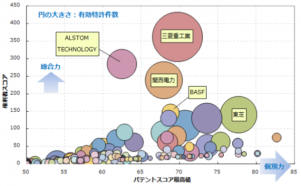 2位ALSTOM TECHNOLOGYは、「二酸化炭素の回収量を増大させつつ、リッチアミン溶液を再生するためのシステム」に関する技術などが、3位関西電力は、三菱重工業との共同出願である「スチーム凝縮水の余熱などを効率的に用いることでエネルギー効率を一層向上させるCO2回収装置」に関する技術などが注目度の高い特許として挙げられます。
