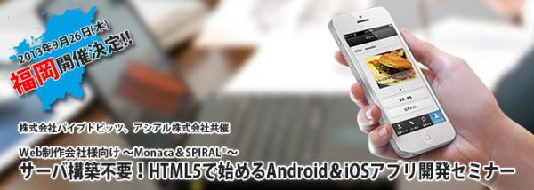 株式会社パイプドビッツ(本社:東京都港区、代表取締役社長CEO:佐谷宣昭、証券コード3831、以下「パイプドビッツ」)とアシアル株式会社(本社:東京都文京区、代表取締役:田中正裕、以下「アシアル」)は、Web制作会社様を対象として「~Monaca&SPIRAL(R)~ サーバ構築不要!HTML5で始めるAndroid&iOSアプリ開発セミナー」を、2013年9月26日に福岡市博多区の福岡県Ruby・コンテンツ産業振興センターにて追加開催しますので、お知らせいたします。