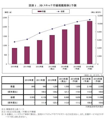 ◆ 2016 年度の国内3D スキャナ市場は2,300 台、11,000 百万円と大幅成長を予測