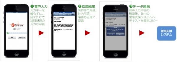保険販売業務において、業務日報作成は、顧客ニーズの把握とコンプライアンスの観点から重要な業務の一つとなっています。そのため業務日報には、顧客との商談内容を詳細かつ正確・迅速に記録し、報告することが求められていますが、訪問販売の場合、営業担当者は帰社後に1日分の業務日報を作成するため、時間の経過による報告漏れや残業の長時間化などが懸念されており、アドバンスクリエイトでは、訪問の往復時間、特に徒歩移動中でもスマートフォンを活用して商談内容を記録する方法を検討していました。その結果、商談内容を音声で入力し、株式会社セールスフォース・ドットコムのForce.comをベースに作られた顧客管理システム(社内呼称:御用聞き)とデータ連携する機能を実現致しました。