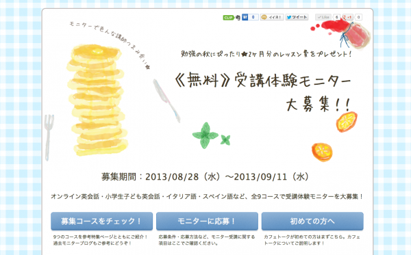 そんな熱い注目の中、第8弾募集がスタート。モニター当選者はカフェトークの有料レッスンの中からお好きなレッスンを選び、合計8回分のレッスンを無料で受講できます。