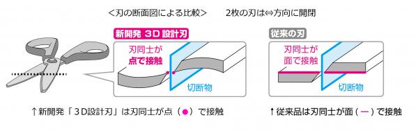 新開発の「3D設計刃」は、刃に施した立体的な曲面加工により、2枚の刃の接する面積を極限まで減少。刃の構造により、従来品比約100倍以上※1という究極の非粘着性を実現しました。刃が粘着物でベタつかず、軽い切れ味がずっと持続します。